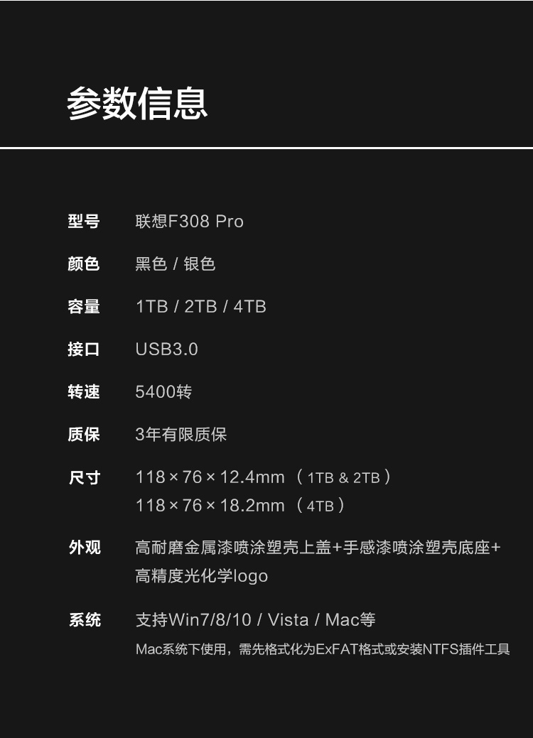 联想(Lenovo) F308 Pro 2TB USB3.0 移动硬盘 2.5英寸 暮辰黑 稳定耐用 轻松备份 高速传输